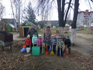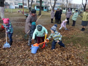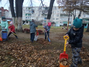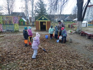 В детском саду «Берёзка» пос.им.Горького дети с воодушевлением и энтузиазмом помогают взрослым наводить порядок на участке для прогулок. Розовощекие от осенней свежести дети дружно убирают листву, вооружившись граблями и метлами. В процессе трудовой деятельности воспитанники учатся доводить начатое дело до конца, у них формируются представления о значимости труда для себя и окружающих.