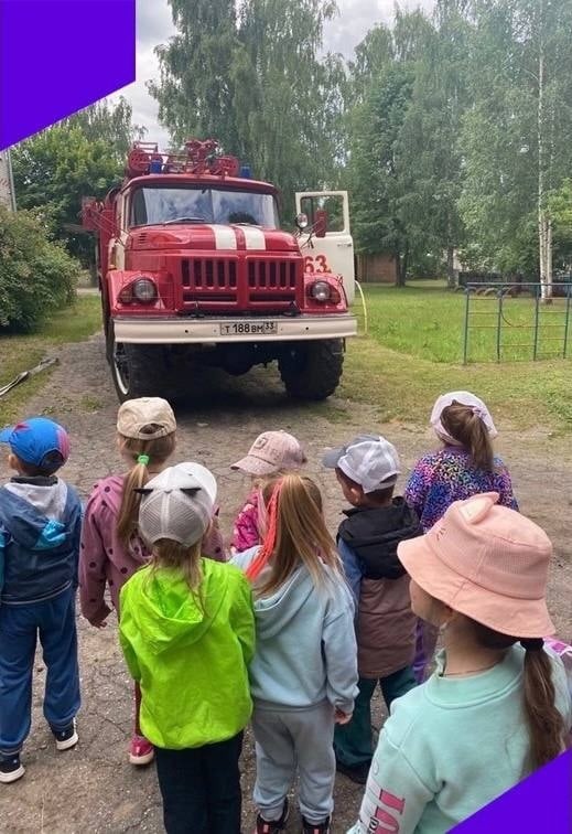 Детям показали оснащение пожарного автомобиля, их предназначение и возможности.