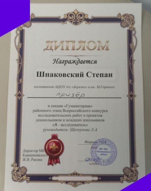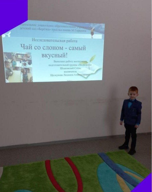 Сегодня на базе детского сада "Светлячок" г. Камешково проходил районный этап Всероссийского конкурса исследовательских работ и проектов дошкольников и младших школьников "Я-исследователь". В гуманитарной секции с исследовательской работой "Чай со слоном- самый вкусный!" призёром стал воспитанник подготовительной к школе группы нашего детского сада, Шпаковский Степан.( педагог Щелкунова Людмила Александровна).