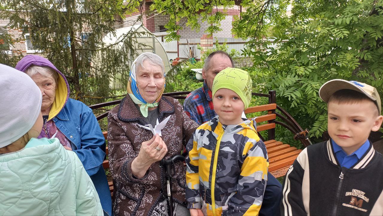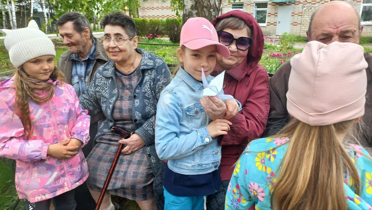 На память дети вручили подарки, сделанные вместе со своими родителями - белых журавликов.