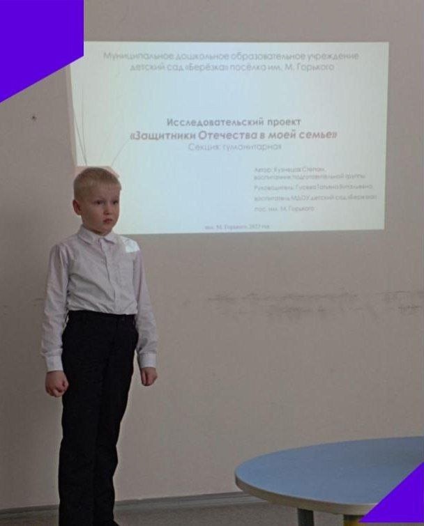 Воспитанник подготовительной к школе группы нашего детского сада, Кузнецов Степан, (воспитатель Гусева Татьяна Витальевна) стал победителем в гуманитарной секции с исследовательской работой "Защитники Отечества в моей семье"