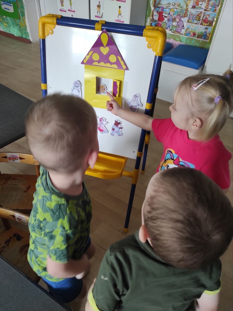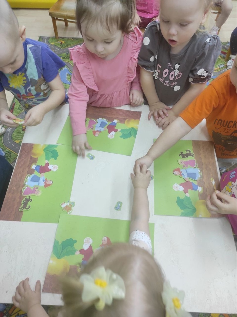 "Репка". Использовали пальчиковый театр, на магнитах, настольный. Сказку " Репка" рассказывали всё вместе, проговаривая слава и действия персонажей.