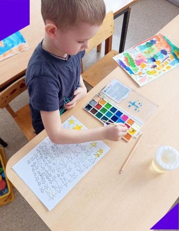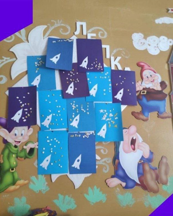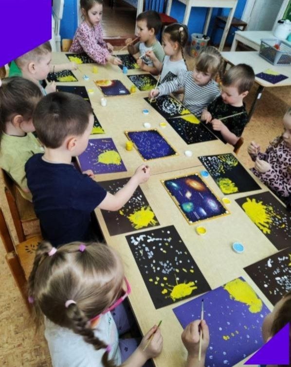Космическая арт-студия: нарисовали "Звёздную галактику", "Запуск ракеты", малыши лепили звезды.