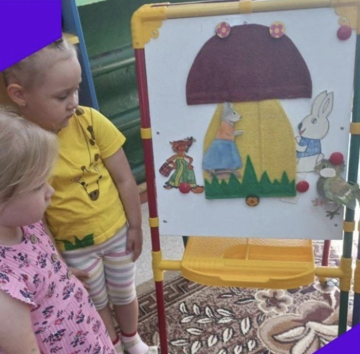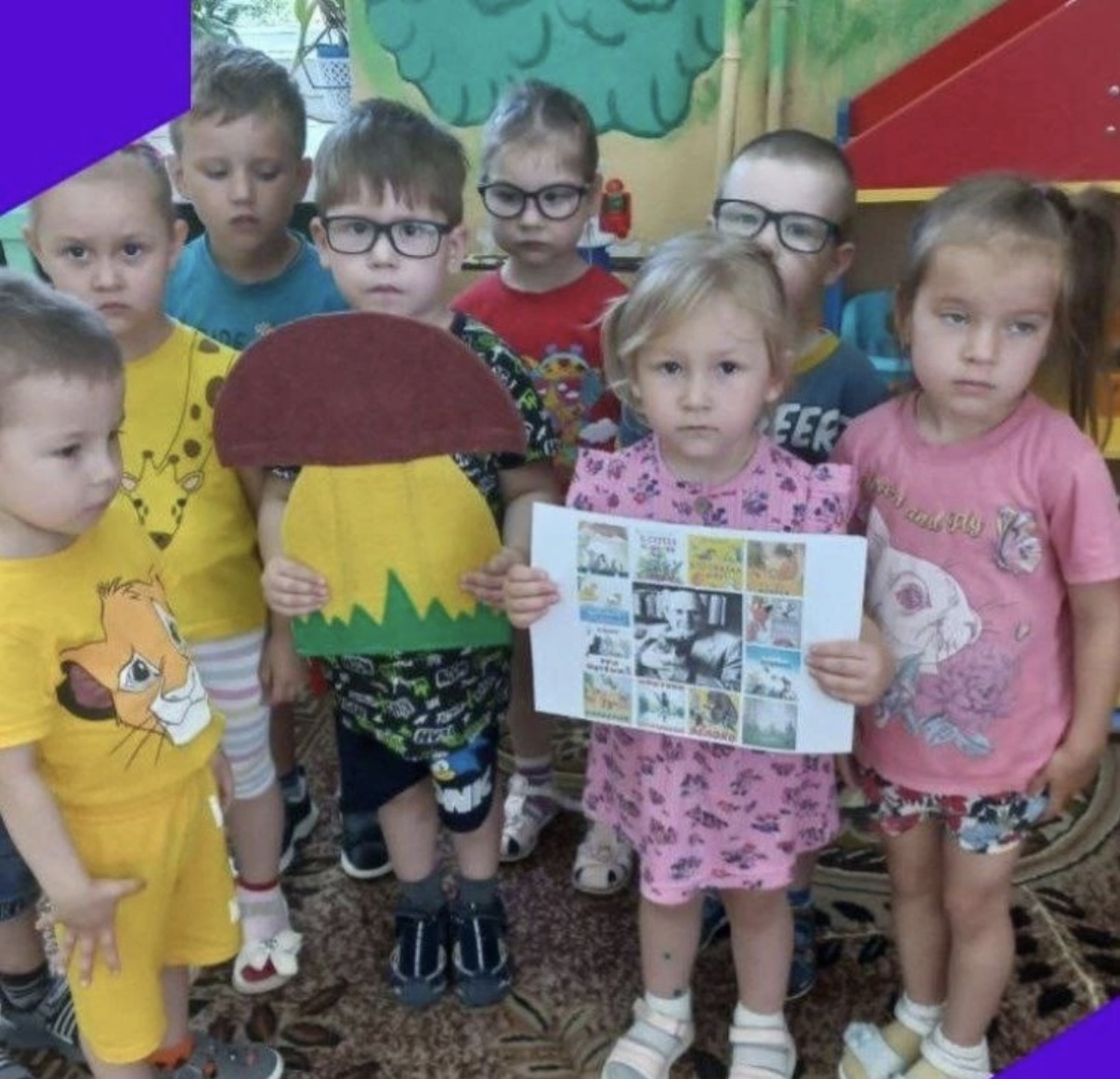 Дети младшей группы совершили путешествие, в сказку "Друзья под грибом". Дети познакомились с творчеством Владимира Григорьевича Сутеева - он сочинял разные истории, писал сказки, по которым созданы любимые мультфильмы для детей. Дети посмотрели книгу с яркими, красочными картинками,