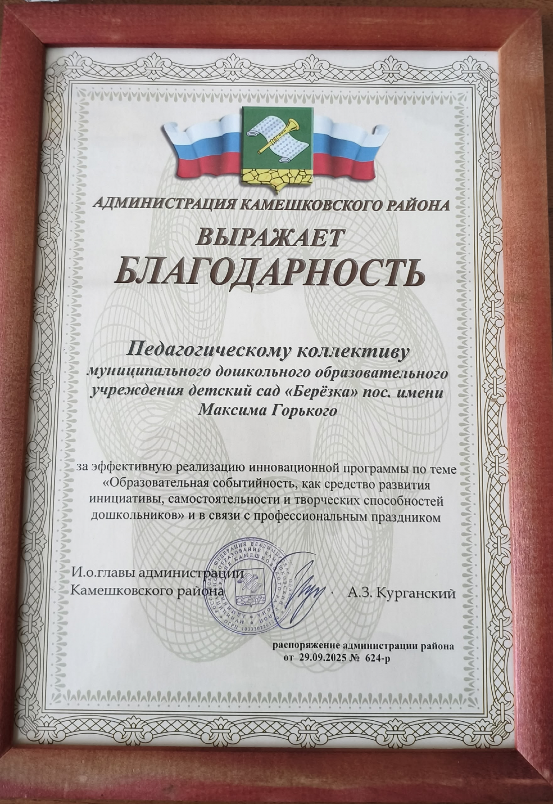 Благодарность Администрации Камешковского района за эффективную реализацию инновационной программы по теме : "Образовательная событийность, как средство развития инициативы, самостоятельности и творческих способностей дошкольников".